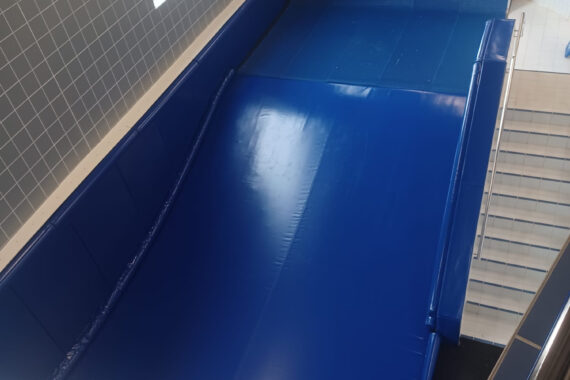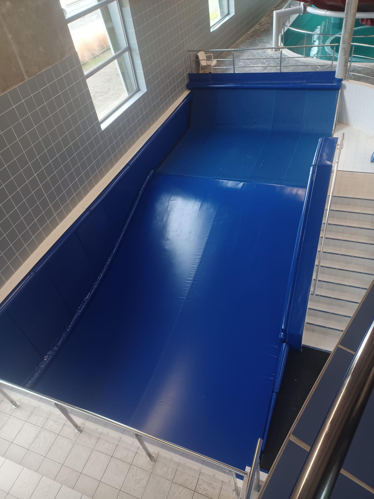 Notre équipe a conçu et fabriqué un nouveau tapis sur mesure en mousse haute densité recouverte d'une bâche PVC renforcée, spécialement adaptée aux contraintes d'un usage collectif : résistance à l'abrasion, traitement antifongique et anti-UV, coutures renforcées et finitions étanches.